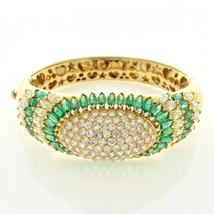 This exquisite bracelet is a true masterpiece of craftsmanship and elegance, designed to make a statement of luxury and sophistication. The bracelet features an impressive array of 130 round diamonds, with a combined total weight of 9 carats. Each diamond is meticulously cut to maximize brilliance, creating a dazzling display of sparkle that catches the light from every angle. Complementing the diamonds are 48 stunning green emeralds, with a total weight of 8 carats. The emeralds are arranged in a harmonious design, their deep green color providing a vivid contrast to the brilliance of the diamonds. The vibrant emeralds are evenly spaced, ensuring a balanced and elegant aesthetic.