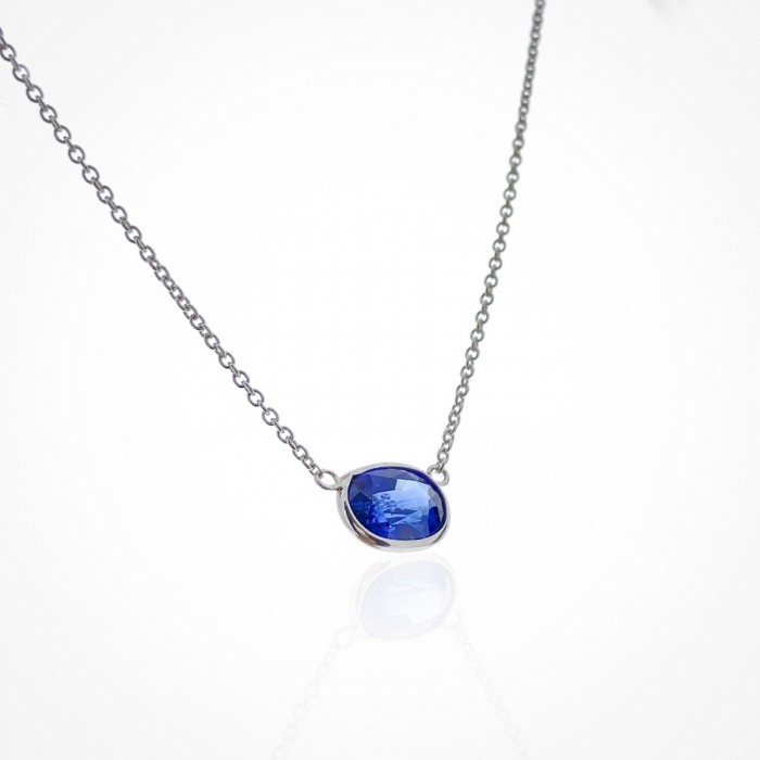 The necklace features a blue sapphire, which is known for its deep, rich blue color. This suggests a fashionable piece with a focus on a vibrant blue gemstone. The sapphire is oval-shaped and weighs 2.29 carats. Sapphires are a popular gemstone, often associated with elegance and luxury. The necklace is set in 14K white gold, which is a durable and shiny metal choice. The white gold will complement the blue sapphire nicely, offering a sleek, modern look.