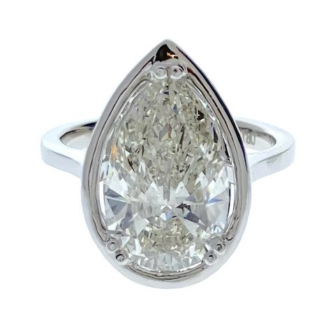 This elegant ring is a stunning example of timeless beauty, featuring a 4.74-carat H, VS lab-grown pear-shaped diamond as its captivating centerpiece. The pear cut, with its teardrop shape, combines the brilliance of a round diamond with the elegance of a marquise, creating a stone that exudes both sparkle and grace. With an H color grade, the diamond appears near colorless, offering a bright and radiant appearance, while its VS clarity ensures the stone is virtually free of inclusions, resulting in exceptional brilliance. The diamond is IGI-certified, guaranteeing its authenticity and high quality, ensuring that every aspect of the stone has been meticulously graded for excellence.