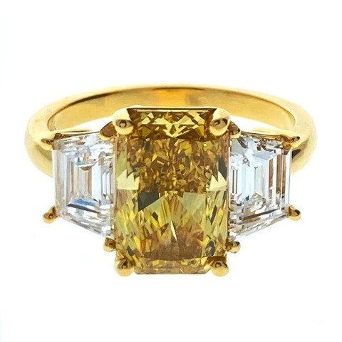 This breathtaking ring combines the allure of vibrant color and timeless elegance, featuring a 3.02-carat rectangular modified brilliant fancy vivid yellow (FVY), VS1 lab-grown diamond as its radiant centerpiece. The modified brilliant cut enhances the diamond's fire and brilliance, while its fancy vivid yellow hue adds an exquisite pop of color, making this diamond truly one-of-a-kind. With a VS1 clarity grade, the diamond is virtually free from inclusions, ensuring a clean, sparkling appearance. Framing the center stone are two trapezoid-shaped lab-grown diamonds, with a combined total weight of 1.51 carats. These trapezoid diamonds are carefully matched to accentuate the central diamond's bold color and brilliance, adding an elegant geometric balance to the design.